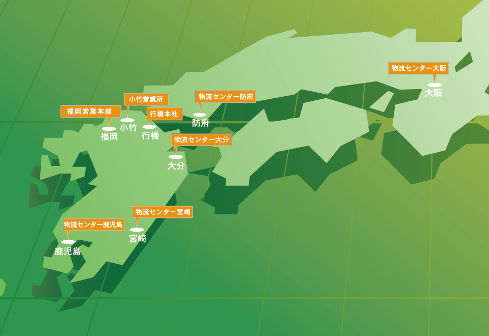デイオー運輸では、関西圏・九州管内の協力企業と強固なネットワークを構築しお客様の配送コストの低減を実現しています。