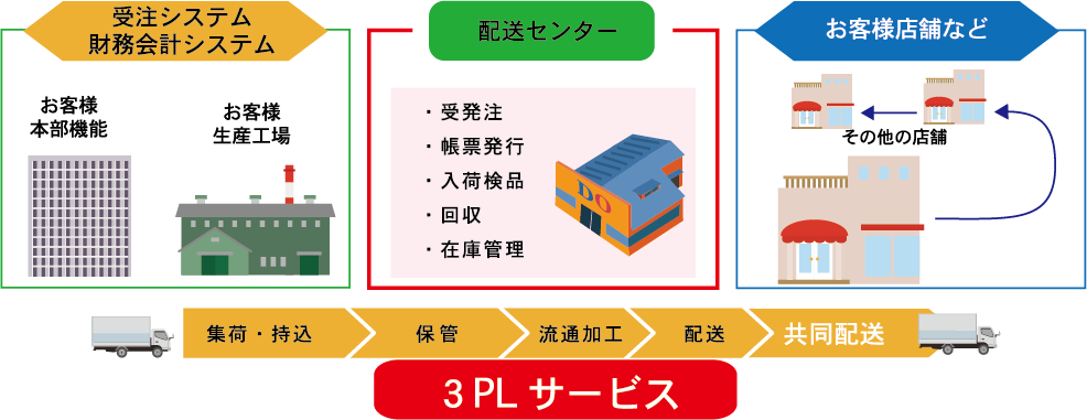 お客様のニーズの多様化と物流業務のアウトソーシングが進む中、サードパーティロジスティクス(3PL)の重要性が日々増加しています。デイオー運輸では早くから3PLサービスに取り組み豊富なノウハウを蓄積してきました。